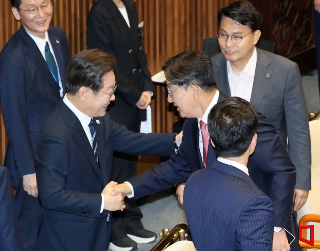 이재명 대통령이 26일 국회 본회의장에서 시정연설을 마친 후 권성동 의원을 비롯한 국민의힘 의원들과 악수하고 있다. 국회사진기자단
