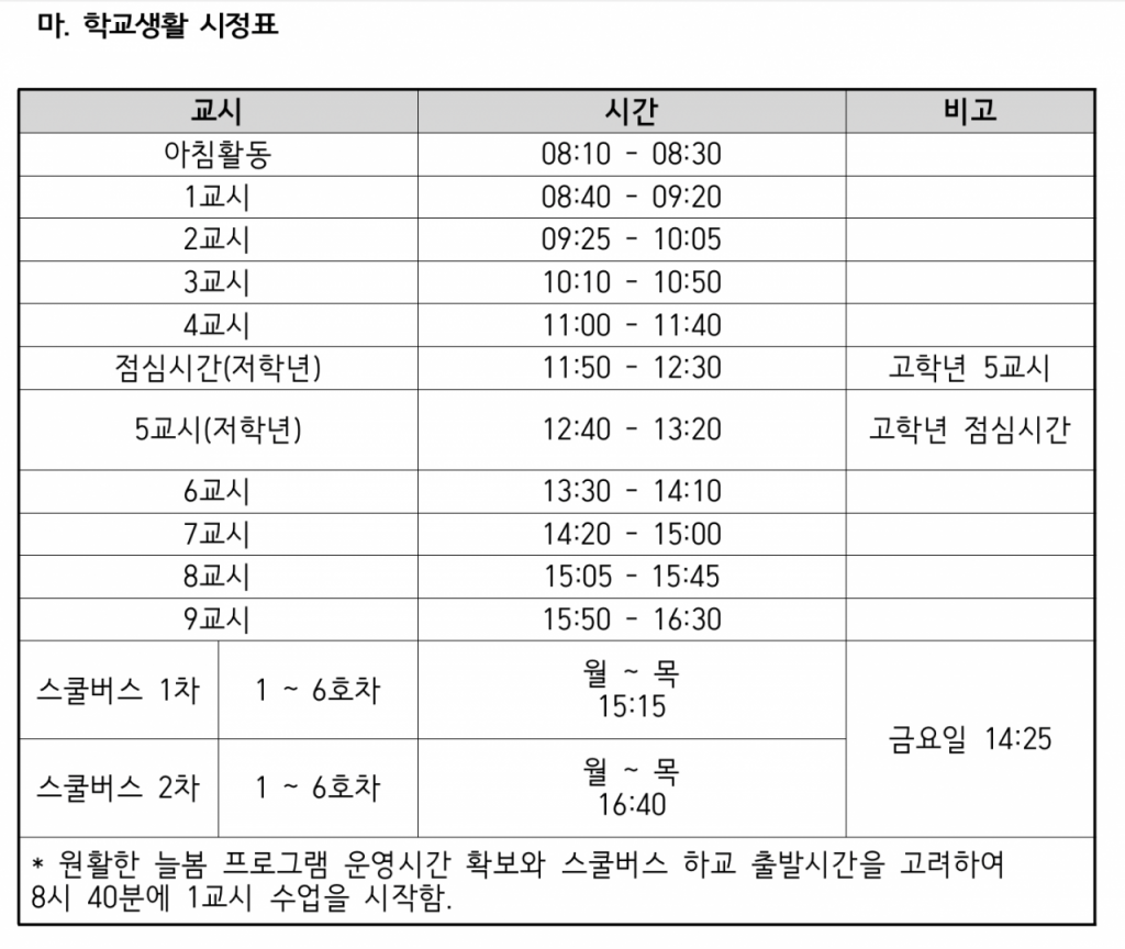 점심시간도 40분으로 짧게 운영되고 있었으며, 방과후 '늘봄학교' 프로그램 역시 스쿨버스 하교시간을 이유로 쉬는 시간이 5분밖에 주어지지 않는 실정이다.