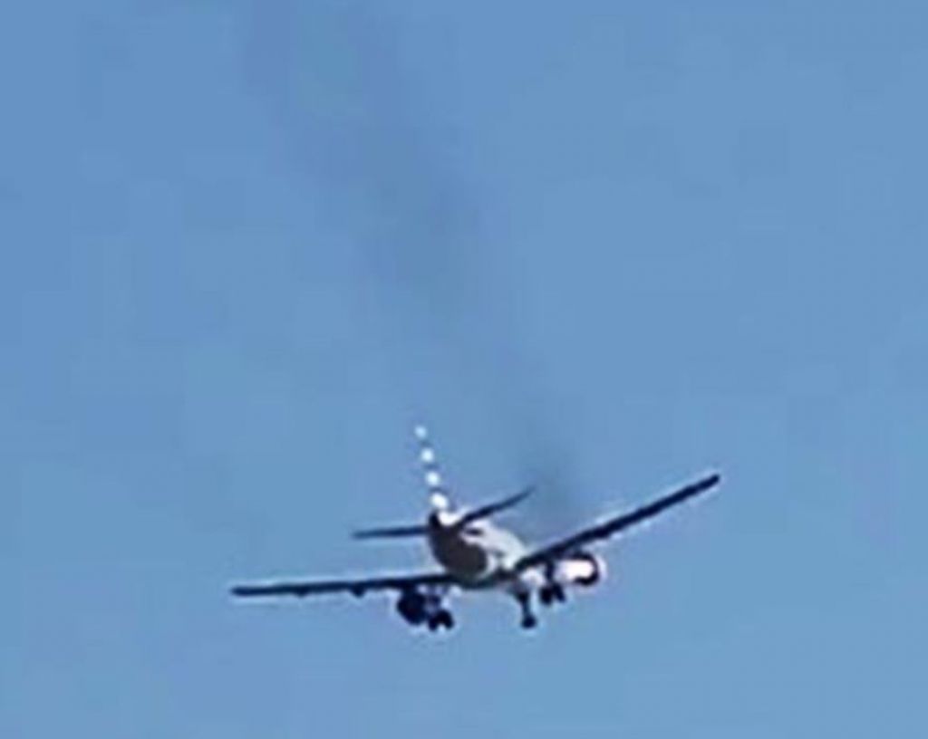 우측 엔진에서 화재가 발생한 아메리칸항공 여객기가 검은 연기를 뿜으며 회항하고 있다. 사회관계망서비스(SNS) 엑스(X 옛 트위터) 캡처
