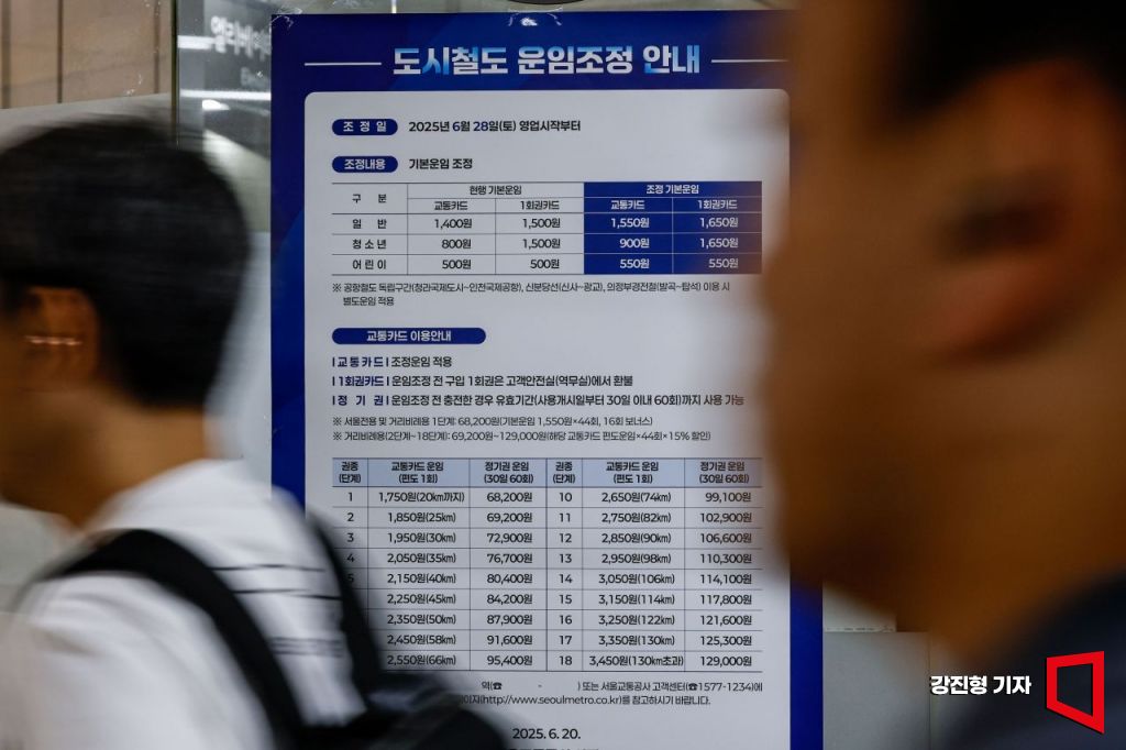 서울 지하철 요금이 내일부터 150원 인상을 앞두고 있는 27일 서울 중구 지하철2호선 을지로입구역에 도시철도 운임조정 안내문이 붙어 있다.