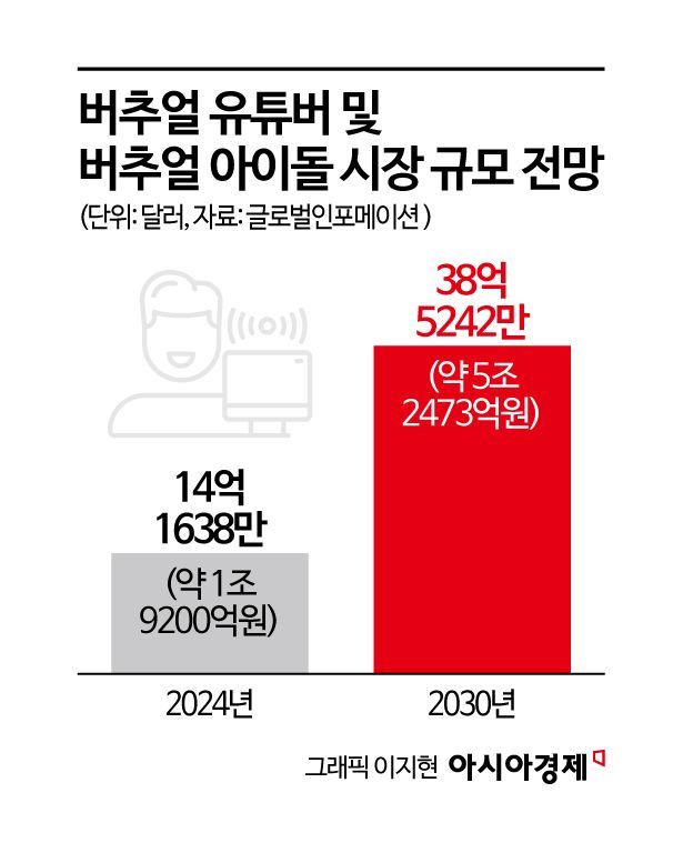 28일 글로벌 시장조사기관 글로벌인포메이션에 따르면 전 세계의 버튜버 및 버추얼 아이돌 시장 규모는 지난해 14억1638만달러(약 1조9200억원)에서 2030년 38억5242만달러(약 5조2473억원)까지 성장할 것으로 전망된다. 버튜버는 가상 캐릭터를 이용해 인터넷 방송을 진행하는 방송인을 뜻한다. 버추얼 아이돌이라고 해도 유튜브 같은 인터넷 방송에서 팬들과 수시로 소통하기 때문에 둘 간의 경계는 모호하다.