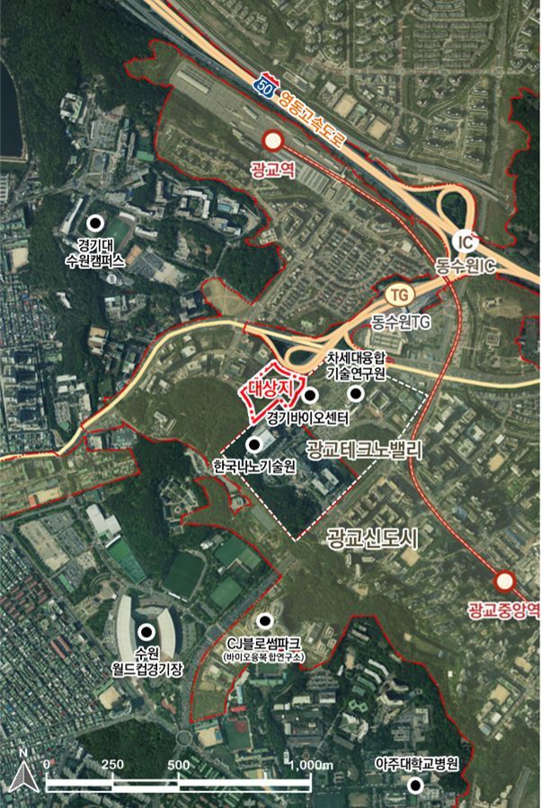 이번 개발 대상지는 영동고속도로와 용인서울고속도로에 인접하고 신분당선 광교중앙역으로부터 1km 내 위치한 우수한 교통 접근성을 갖고 있다. 특히 바이오 혁신 기반을 갖춘 광교 바이오 클러스터 내에 자리하고 있으며, 주변에는 경기도 바이오 광역클러스터를 구성하는 200여 기업과 공공·민간 연구기관들이 밀집해 있다.