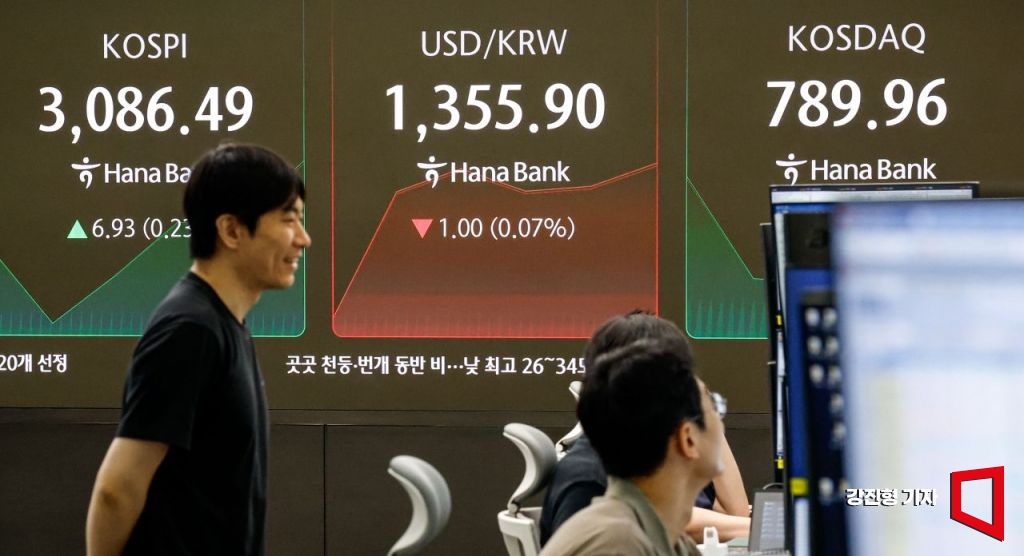 코스피 지수가 전 거래일 대비 1.68포인트 내린 3077.87로 장을 시작한 27일 서울 중구 하나은행 본점 딜링룸에서 딜러들이 업무를 보고 있다. 2025.6.27. 강진형 기자