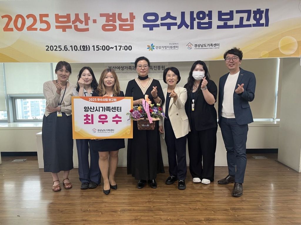 이번 시상은 6월 10일 부산여성가족과 평생교육진흥원 금곡청사에서 열린 '부산-경남 우수사업 보고회'에서 진행됐으며, 공모 결과 총 3개 기관(최우수 1, 우수 2) 중 양산시 가족센터가 최우수상 수상기관으로 선정됐다.