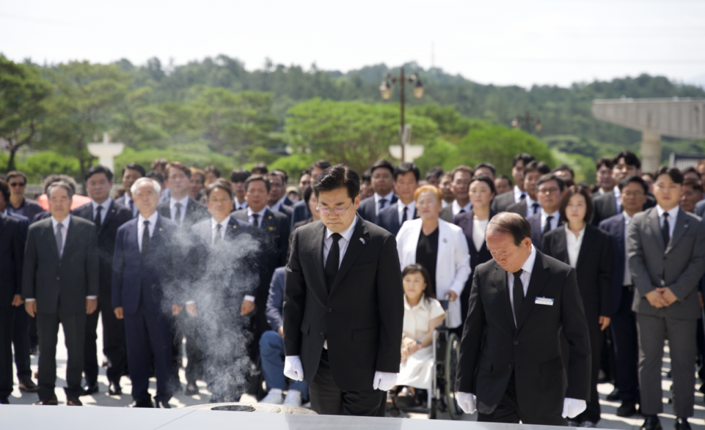 박찬대 더불어민주당 당대표 예비후보가 28일 오전 광주 북구 국립5·18민주묘지를 찾아 민주당 의원단, 당직자들과 함께 추모탑 앞에서 헌화와 분향을 하고 오월 영령에 묵념했다. 이날 박 예비후보는 1980년 5월 전남도청에서 계엄군에게 끝까지 맞서 싸우다 산화한 당시 10대 학생 문재학 열사의 묘역도 참배했다. 문 열사는 한강 작가의 소설 '소년이 온다'의 주인공 '동호'의 실존 인물로 알려져 있다. 송보현 기자