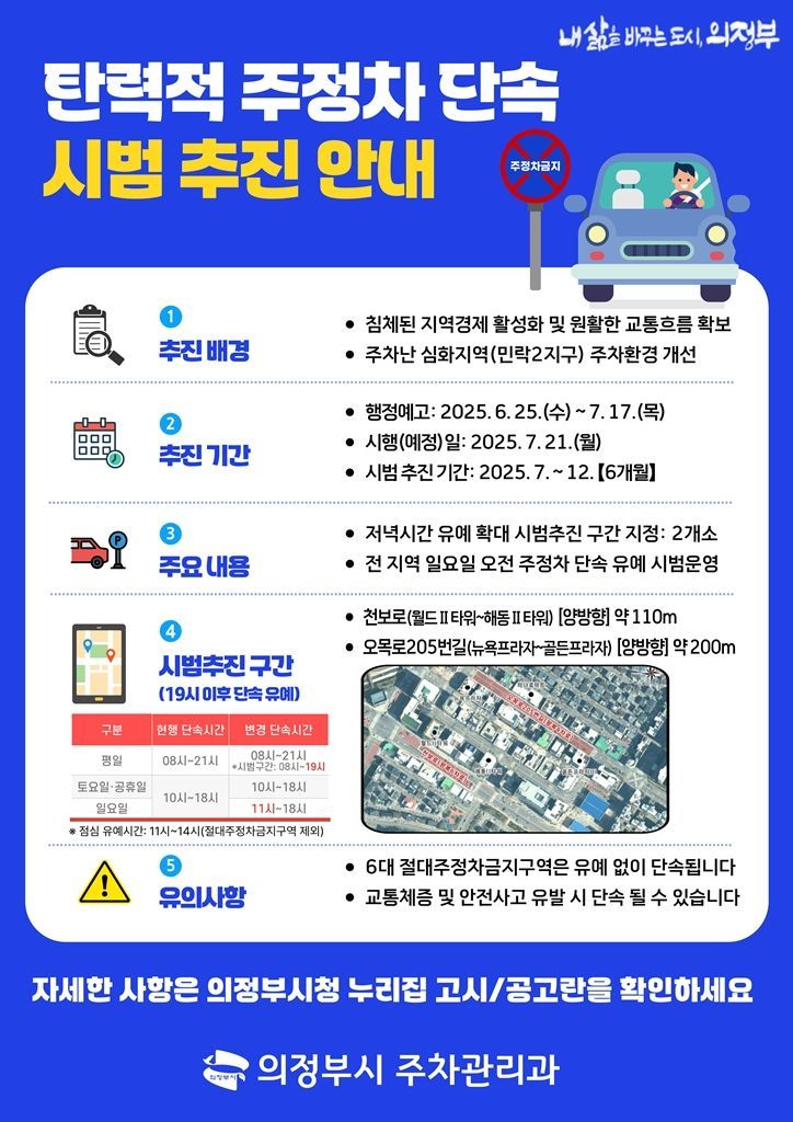 경기 의정부시(시장 김동근)는 오는 7월 21일부터 지역 특성을 고려한 탄력적 주정차 단속 시범 운영에 나서 주차난 해소와 지역경제 활성화를 동시에 도모한다고 28일 밝혔다.