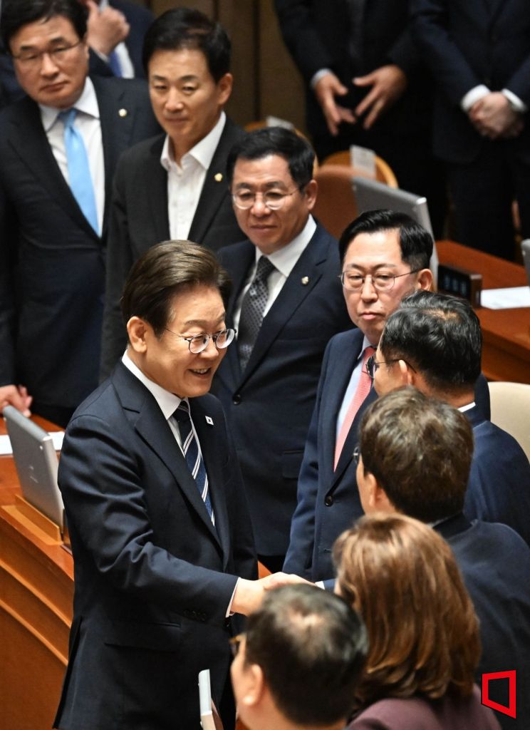 이재명 대통령이 지난 26일 국회 본회의장에서 시정연설을 마친 후 권성동 의원을 비롯한 국민의힘 의원들과 악수하고 있다. 국회사진기자단