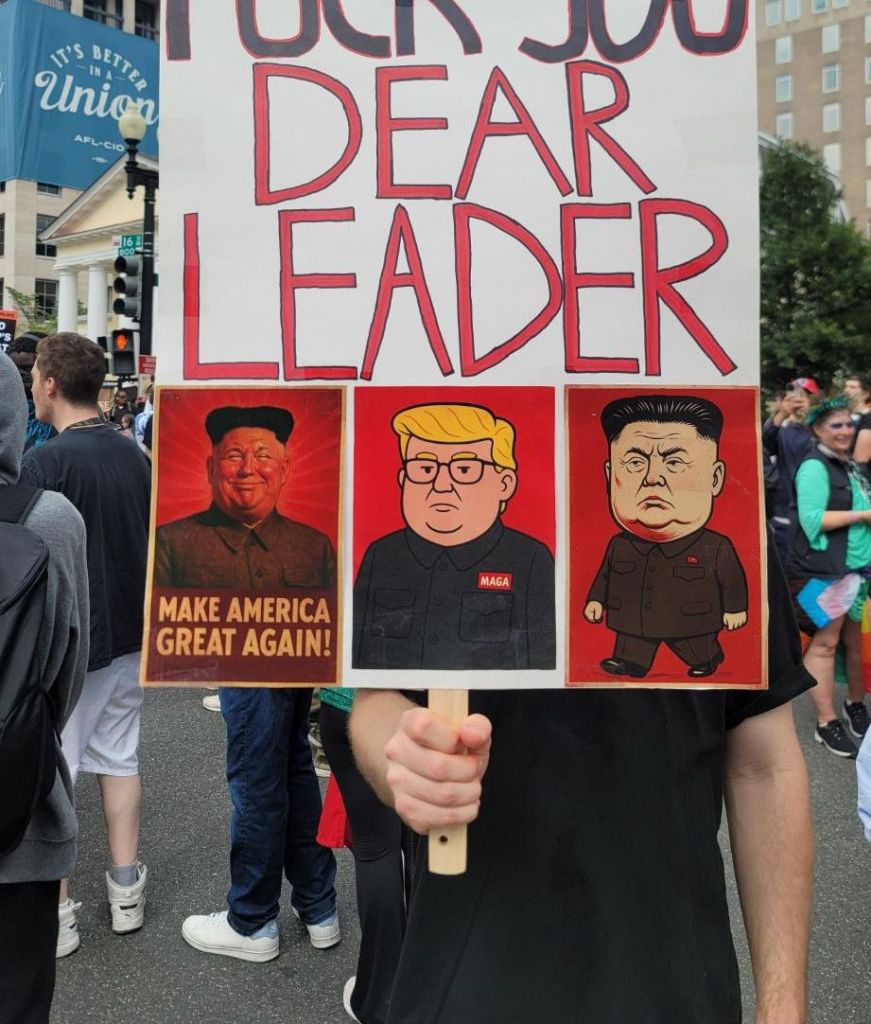14일(현지시간) 워싱턴 DC에서 열린 미 육군 창설 250주년 기념 열병식을 앞두고 백악관 인근 라파예트 광장에서 반(反)트럼프 시위가 열렸다. 한 시위 참가자가 트럼프 대통령과 김정은 북한 국무위원장의 얼굴을 '합성'한 만화가 그려진 피켓을 들고 있다.
