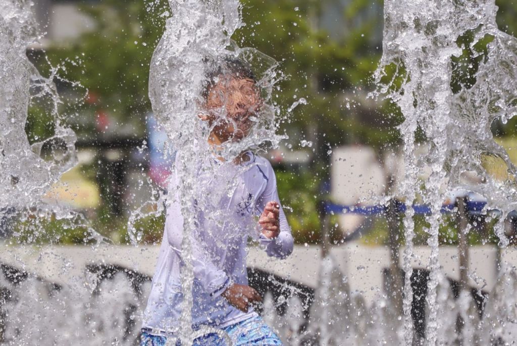 서울의 낮 기온이 34도를 기록한 지난 19일 서울 종로구 광화문 광장 바닥 분수대에서 어린이들이 물놀이를 하며 더위를 식히고 있다. 연합뉴스