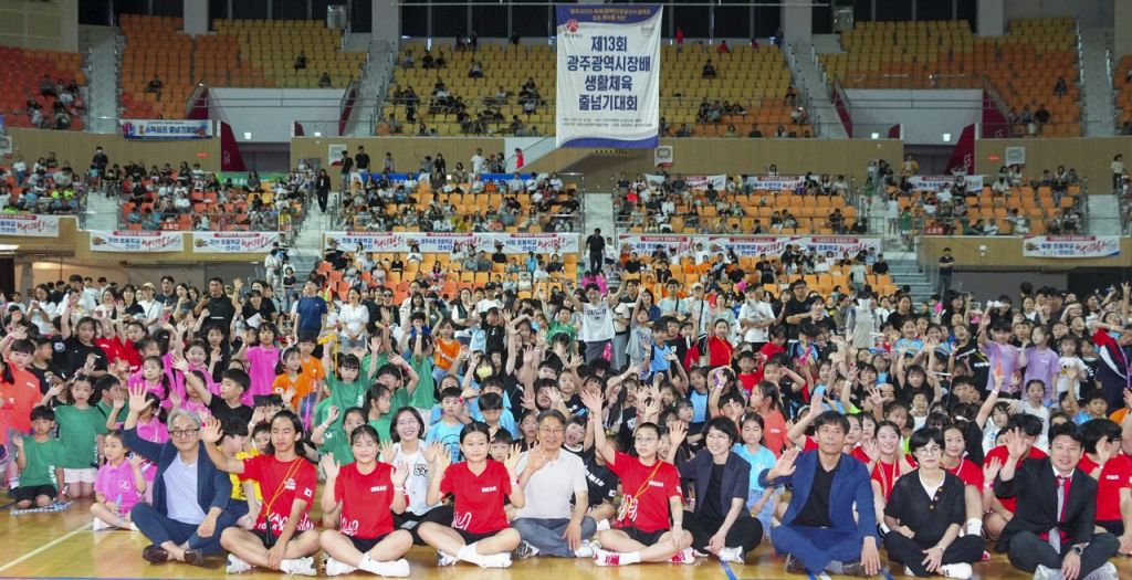 강기정 광주시장이 29일 오전 광산구 광주여대 유니버시아드 체육관에서 열린 '제13회 광주시장배 생활체육 줄넘기대회'에 참석해 장삼순 줄넘기협회 명예회장 및 회원 등과 기념 촬영을 하고 있다. 광주시 제공