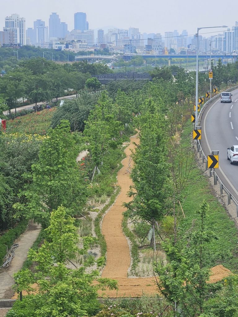 이를 '초록사잇길(Green Link Way)'이라고 이름 짓고 산수유, 미선나무(봄), 수국(여름), 억새(가을) 등 계절감을 살린 관목과 지피식물을 중심으로 식재해 사계절 경관에 변화를 더하고 생동감 있는 녹지 경관을 연출했다. 여름철 시원한 색감을 지닌 다양한 수국 품종을 식재해 볼거리를 제공하고, 인근 '물빛정원 수국원'과의 경관 연계성을 고려한 심미적 통일성도 함께 높였다.