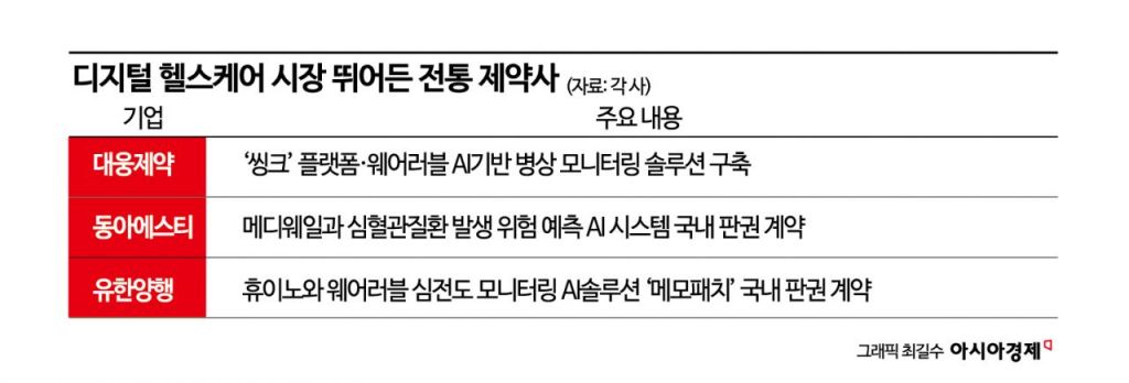 대표적인 기업이 대웅제약이다. 대웅제약은 지난해부터 '스마트 병원 솔루션 기업'으로의 도약을 목표로 웨어러블 기반 생체신호 모니터링 플랫폼 'ThynC(씽크)'를 주축으로 한 디지털 헬스케어 생태계를 본격 가동하고 있다. 주요 병원과 협업해 ECG(심전도) 분석, 혈압·혈당 측정, 인공지능(AI) 분석까지 가능한 통합 시스템을 구축하고 있다.