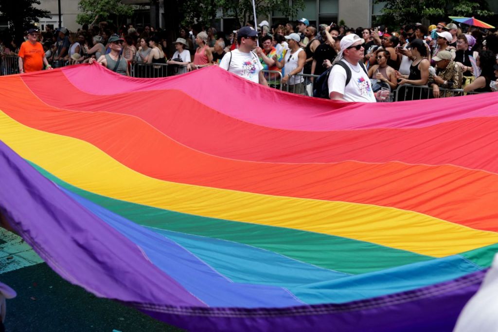 뉴욕 프라이드 행진에서 퍼레이드 참가자들이 대형 프라이드 깃발을 들고 있다. AFP연합뉴스.