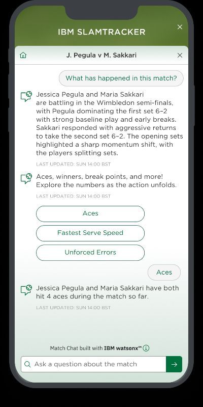매치 챗은 윔블던의 편집 스타일과 테니스 용어에 맞춰 학습된 거대언어모델(LLM)과 여러 AI 에이전트로 구성된 기술을 기반으로, 왓슨x 오케스트레이트 위에 구축됐다.
