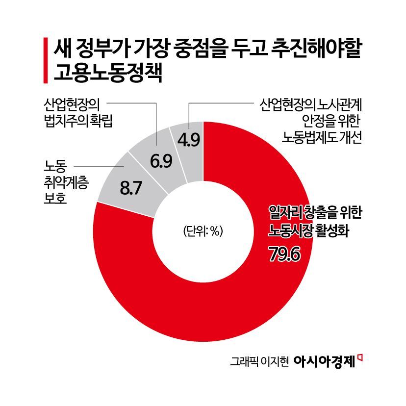 30일 한국경영자총협회가 국내 경영·경제학과 교수 103명을 대상으로 '새 정부에 바라는 고용노동정책'에 대한 설문조사를 실시한 결과, 전체 응답자의 79.6%가 '일자리 창출을 위한 노동시장 활성화'라고 답했다.