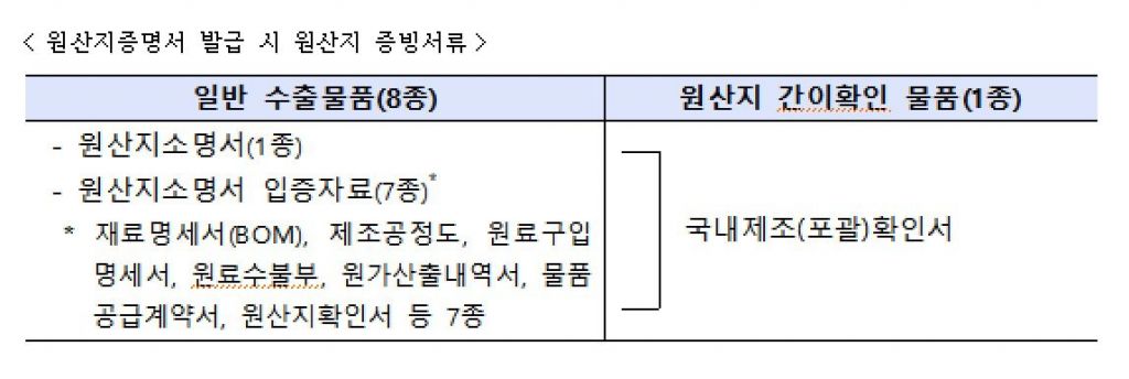 기존에는 원산지증명서를 발급받기 위해 원산지 소명서, 제조공정도, 원료 구입 명세서 등 해당 물품이 한국산임을 증명할 수 있는 8가지 서류를 갖춰 세관(또는 상공회의소)에 제출해야 했다. 하지만 앞으로는 국내 제조(포괄)확인서 하나만으로 기존에 제출하던 8종의 서류를 대체할 수 있게 된다.