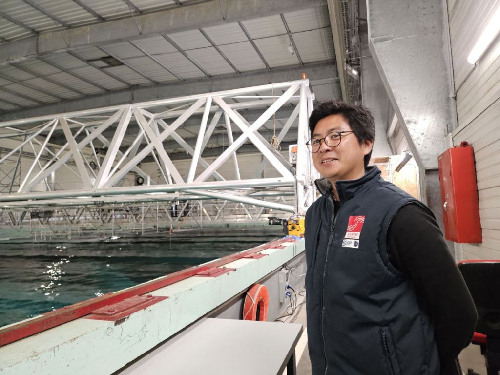 한승윤 에콜 성트랄 낭트 LHEEA 연구교수가 연구 중인 해상 풍력 프로젝트를 설명하고 있다. 뒤로 보이는 것은 인공적으로 파도를 발생시키는 장치. 전진영 기자.