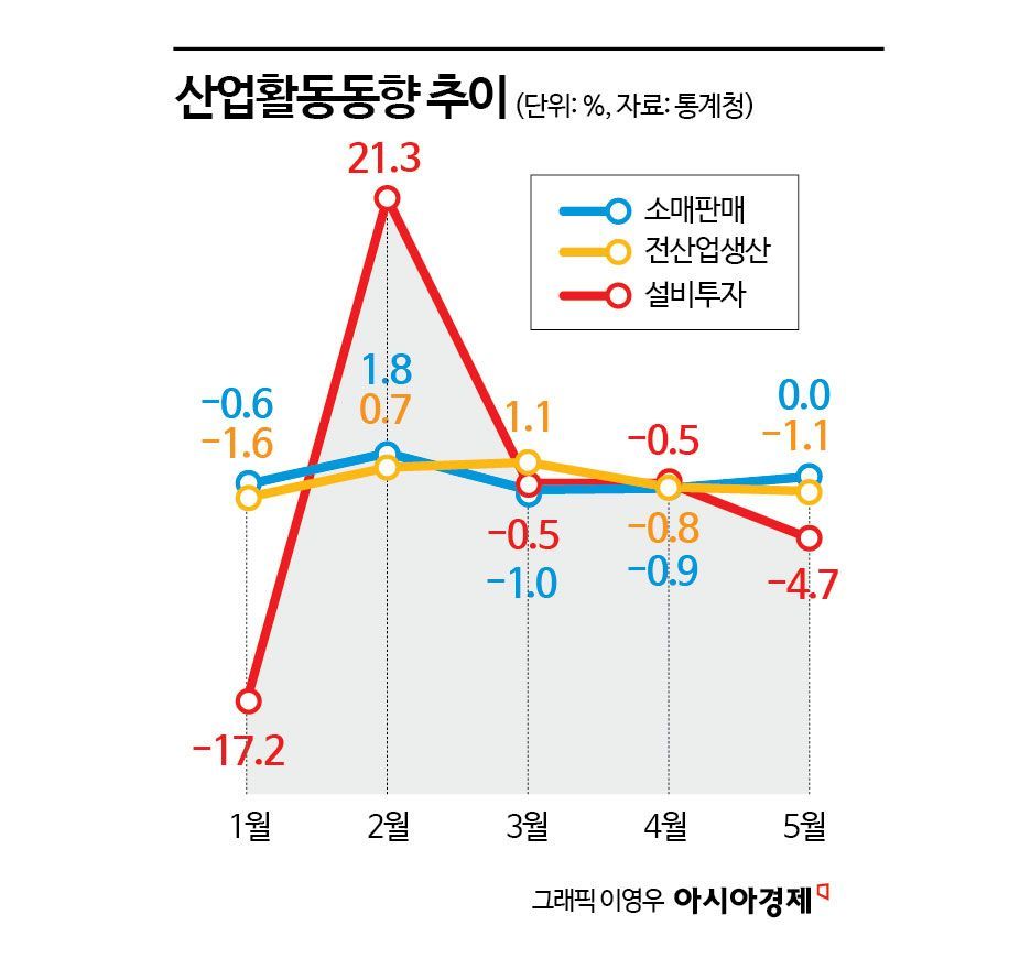 내수 부진이 산업활동 전반에 영향을 미치며 지난달 전 산업 생산과 투자가 모두 감소했다. 소비를 나타내는 소매판매는 보합세를 보였지만 여전히 미약한 모습이다. 현 경기 상황과 전망을 살펴볼 수 있는 경기종합지수도 넉 달 만에 모두 감소 전환했다. 정부는 신속한 추가경정예산(추경) 집행으로 내수 활성화와 민생 회복에 집중한다는 방침이다.