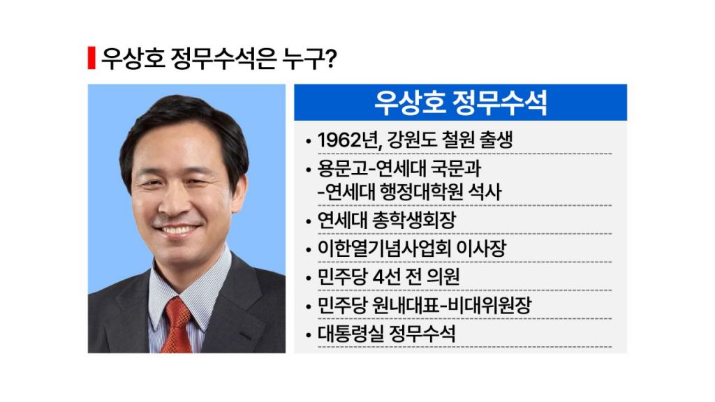 이재명 대통령은 지난 6월 8일 우 수석을 임명하며 이유를 이렇게 설명했다. "여야 상생에 대한 확고한 철학을 갖춘 인물로 통합의 적임자라는 평가를 받는다. 오랜 의정 경험을 바탕으로 국정 전반에 대한 높은 이해와 합리성 뛰어난 정무 감각을 겸비해 대통령실과 국회의 가교 역할을 훌륭히 해낼 것으로 기대한다."