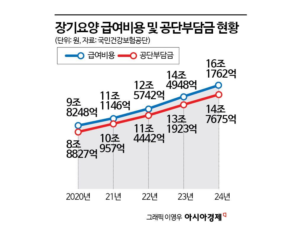2024년 한 해 장기요양 급여 비용은 16조1762억원으로 전년 대비 11.6% 늘며 처음으로 16조원을 넘어섰다. 장기요양 급여 비용은 2020년 9조8248억원, 2021년 11조1146억원, 2022년 12조5742억원, 2023년 14조4948억원 등으로 빠르게 늘며 매년 역대 최대치를 경신하고 있다.