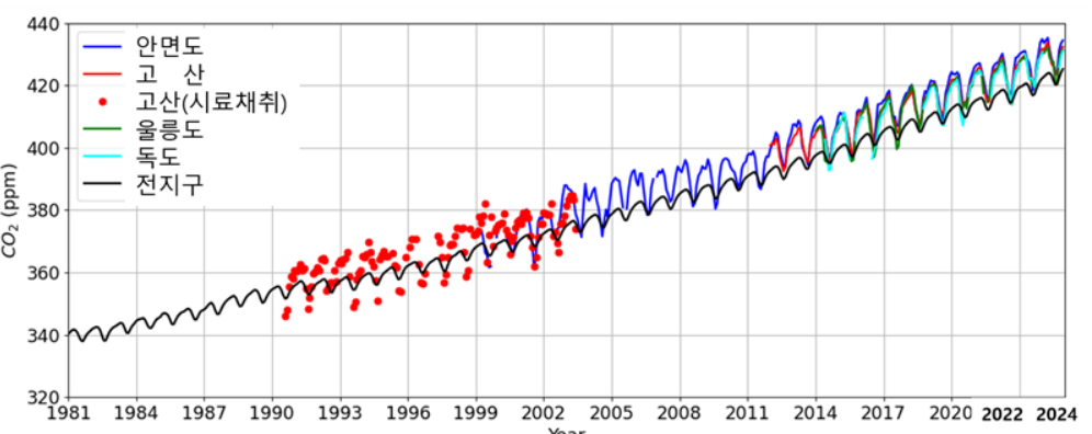 안면도의 경우는 2023년보다 3.1ppm 증가해 2016년에 이어 최근 10년(2015∼2024년)간 두 번째로 연간 증가 폭이 컸다. 고산과 울릉도는 각각 전년 대비 2.9ppm, 2.4ppm 증가했다.