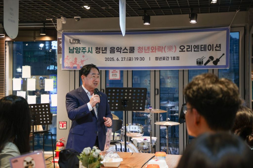 주광덕 남양주시장이 지난 27일 청년 음악스쿨 '청년와락(樂)'의 본격적인 시작을 알리는 오리엔테이션에 참석해 인사말을 하고 있다. 남양주시 제공