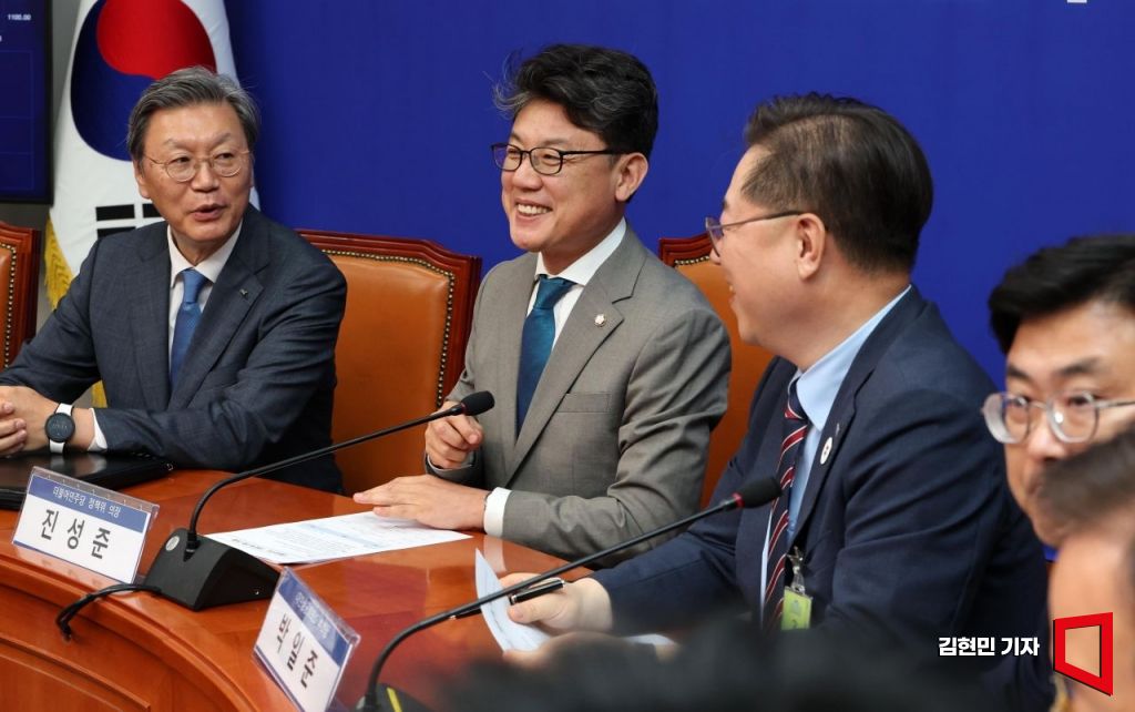 진성준 더불어민주당 정책위의장이 30일 국회에서 상법 개정안 추진 관련 경제계 의견 수렴을 위한 경제6단체 부회장단과 간담회를 하고 있다. 이번 간담회에는 박일준 대한상공회의소 상근부회장, 김창범 한국경제인협회 상근부회장, 이동근 한국경영자총협회 상근부회장, 장석민 한국무역협회 전무, 오기웅 중소기업중앙회 상근부회장, 이호준 한국중견기업연합회 상근부회장, 정우영 한국상장사협회 부회장 등이 참석했다. 2025.6.30 김현민 기자
