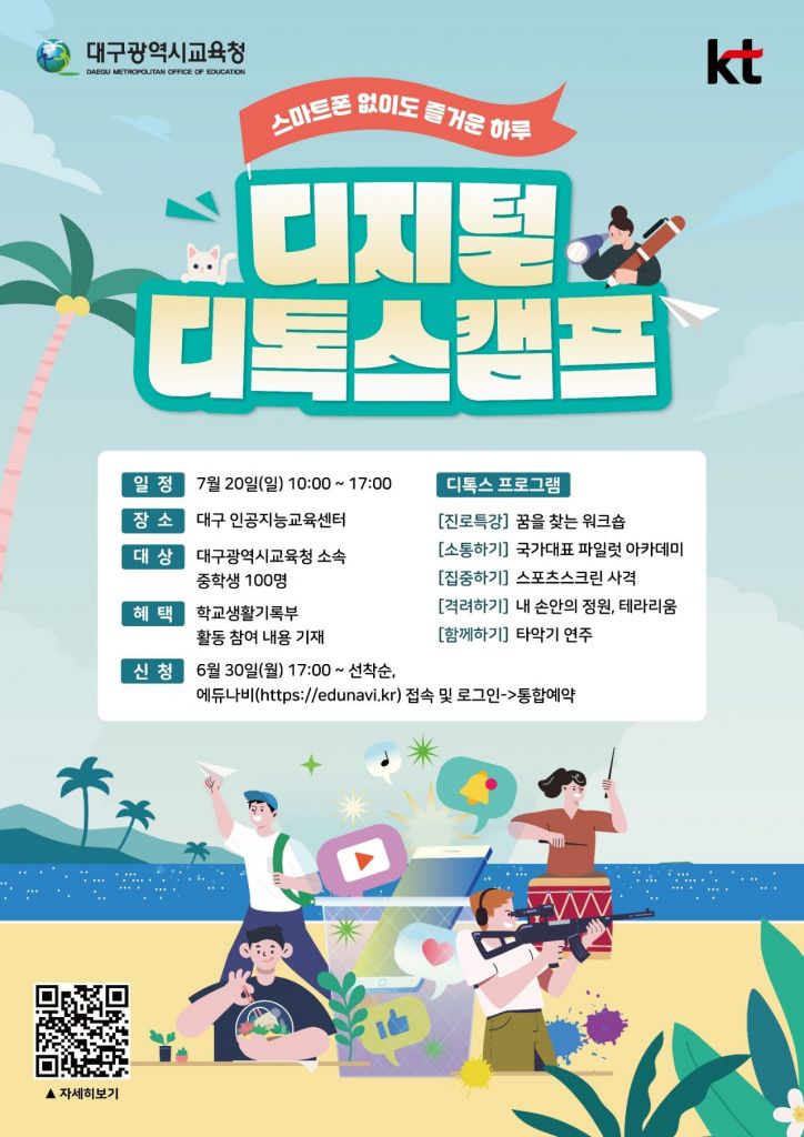 대구시교육청(교육감 강은희)은 KT와 함께 오는 7월 20일 오전 10시부터 오후 5시까지 대구인공지능교육센터에서 중학생 100명을 대상으로 '스마트폰 없이도 즐거운 하루! 디지털 디톡스 캠프'를 개최한다고 30일 밝혔다.