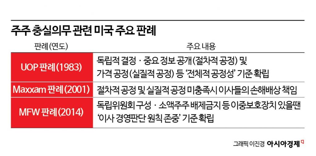 '와인버거 대 UOP' 사건(이하 UOP 판례)과 '칸 대 M&F월드와이드' 사건(이하 MFW판례)은 소액주주 보호와 관련한 미국 회사법 판례의 기준점을 세운 중요한 사건이다. 경영진에 아주 엄격한 절차적·실질적 공정성을 요구하다가(UOP 판례) 그나마 엄격한 조건 하에 이사의 경영 판단 원칙을 존중하는 쪽으로 다소 완화했다(MFW 판례)는 게 핵심이다. 하지만 지배주주와 소액주주 사이에 차별이 없게 해야 한다는 대원칙은 동일하다.
