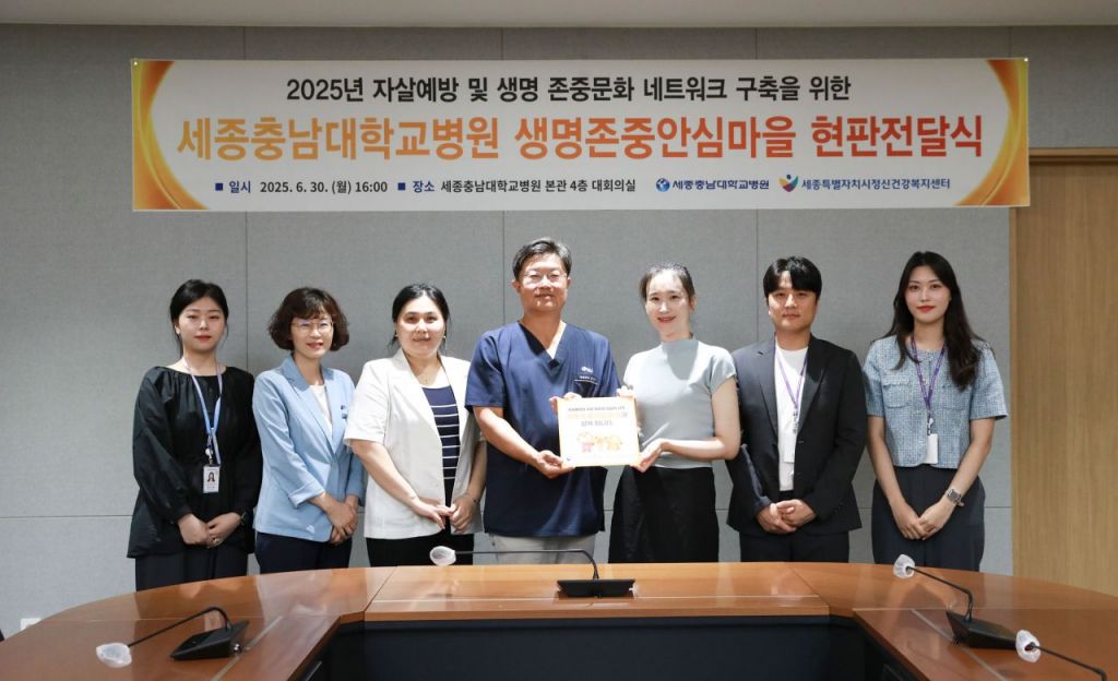 세종충남대학교병원은 세종시정신건강복지센터의 2025년도 도담동 생명 존중 안심마을 사업 보건의료 영역에 지정돼 30일 현판을 전달받고 이같이 밝혔다.