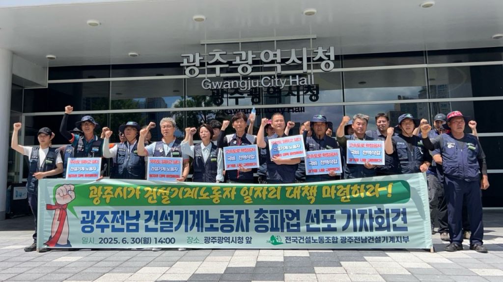 전국건설노동조합 광주·전남건설기계지부는 30일 오후 광주시청 앞에서 총파업 선포 기자회견을 열고 "어려운 건설경기 속에서도 '동광주~광산 고속도로 확장공사'와 '전남·일신방직 부지 개발' 소식은 지역 건설기계 노동자들에게 일말의 희망이었다"며 "하지만 '더현대' 착공은 깜깜 무소식이고, 광주시가 최소한의 분담금마저 납부하지 않아 지연되던 호남고속도로 확장공사는 이재명 정부의 국비 예산 전액 삭감으로 사업 자체가 좌초 위기에 놓였다"고 주장했다.