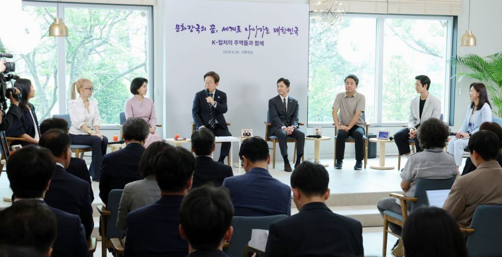 이 대통령은 이날 김혜경 여사와 함께 '문화예술계 수상자 간담회'를 열고 문화콘텐츠 산업 발전에 관한 얘기를 나눴다. 간담회에는 토니상 6관왕에 오른 뮤지컬 '어쩌면 해피엔딩'의 박천휴 작가, 드라마 '폭싹 속았수다'의 김원석 감독, 중단편 영화 '첫여름'으로 칸국제영화제 라 시네프 1등 상을 받은 허가영 감독, 조수미 성악가, 박윤재 발레리노 등이 참석했다.