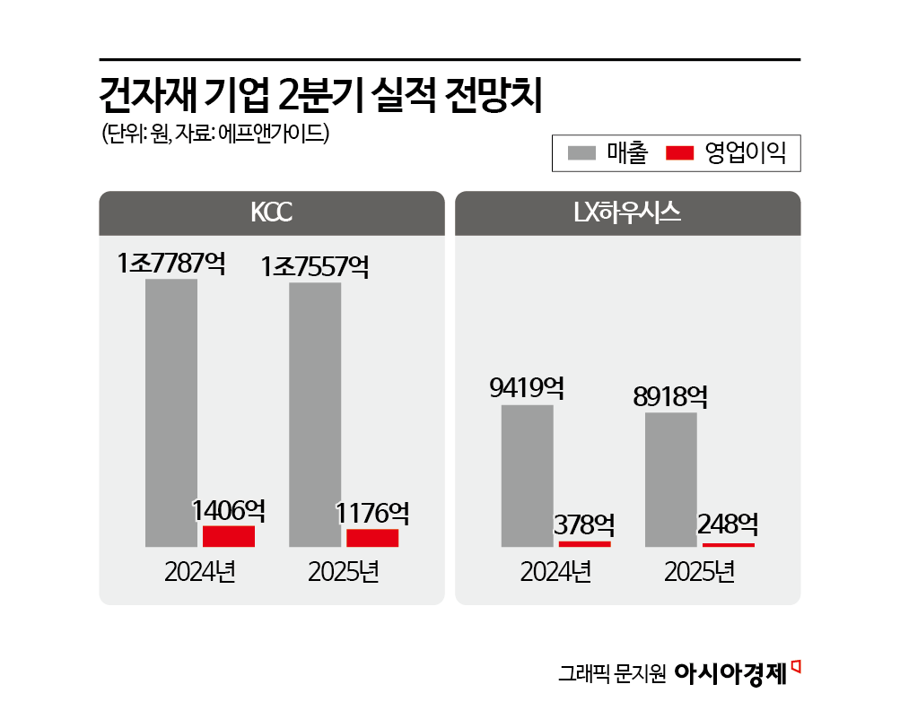 1일 에프앤가이드에 따르면 2분기 국내 주요 건자재 기업의 실적 전망치(컨센서스)는 지난해 동기보다 악화한 것으로 나타났다. KCC의 2분기 매출은 전년 동기 대비 1.29% 감소한 1조7557억원, LX하우시스의 매출은 5.32% 감소한 8918억원을 기록할 것으로 전망됐다. 두 회사 모두 수익성도 악화할 것이란 전망이다. 영업이익은 각각 16.4%, 34.4% 줄 것으로 예상된다.
