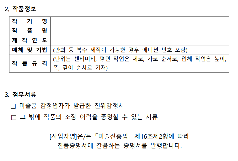 진품증명서에 갈음하는 증명서 서식. 문화체육관광부