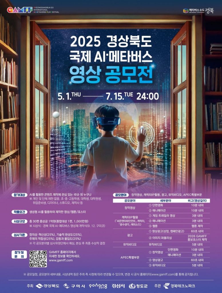 경북도는 '2025 경북 국제 AI·메타버스 영상 공모전'의 작품 접수 마감일을 애초 6월 30일에서 7월 15일 까지 15일간 연장한다.