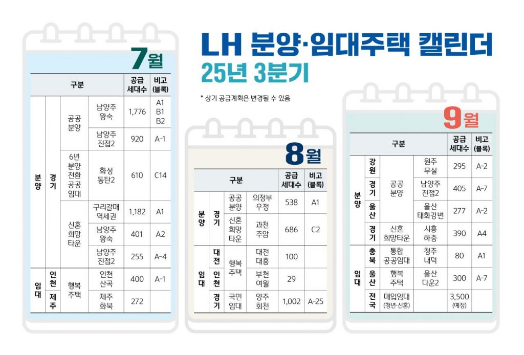 8월에는 의정부우정 지구에 538가구(공공분양), 과천주암지구에 686가구(신혼희망)를 공급한다. 9월엔 강원 원주무실지구 295가구, 남양주진접2·울산태화강변지구에 각 405가구, 277가구를 공공분양으로 공급한다. 경기 시흥하중지구에는 390가구를 신혼희망타운으로 내놓는다.