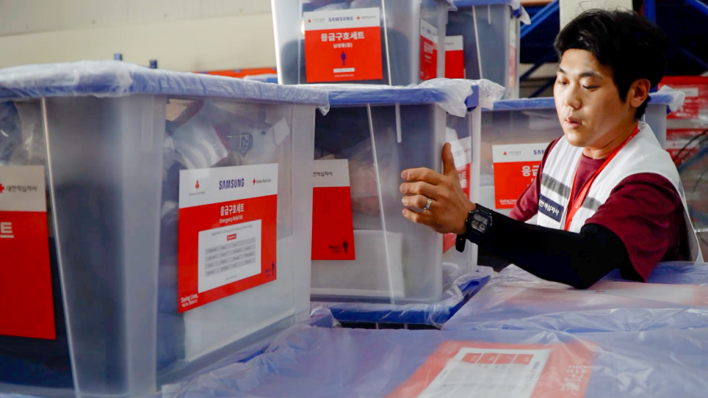 대한적십자사 직원이 수해를 대비해 응급구호세트를 정비하고 있다. 대한적십자사