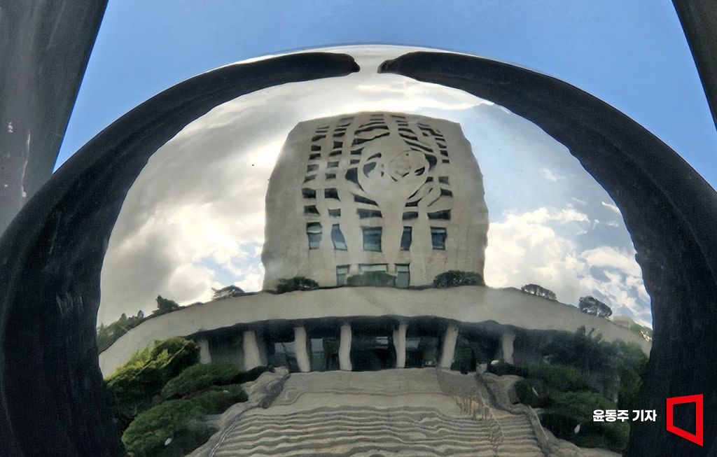 심우정 검찰총장이 임기 9개월만에 사의를 표명한 1일 서울 서초구 대검찰청 조형물을 통해 보이는 대검청사가 일그러져 보이고 있다. 내란특검은 윤석열 전 대통령의 구속취소 이후 즉시항고를 포기한 심우정 총장을 직권남용 등 혐의로 수사할 예정이다.