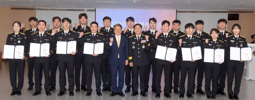 강기정 광주시장이 1일 오전 시청 중회의실에서 신임 소방공무원에게 임명장을 수여한 후 기념 촬영을 하고 있다. 광주시 제공