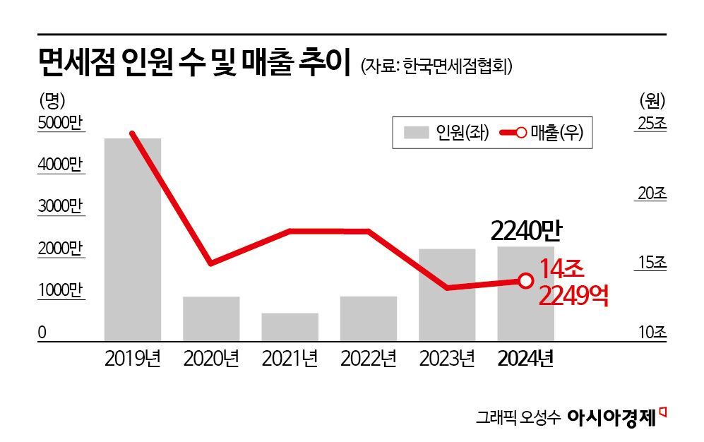 코로나19 팬데믹(세계적 대유행)으로 직격탄을 맞은 면세업계의 업황은 회복이 더딘 상황이다. 한국면세점협회에 따르면 2019년 국내 면세 시장 매출은 24조8600억원, 이용객은 4840만명에 달했으나 지난해에는 매출 14조2250억원, 이용객은 2840만명으로 줄었다. 롯데와 신라, 신세계, 현대 등 주요 면세사업자의 영업손실은 2800억원에 달했다.