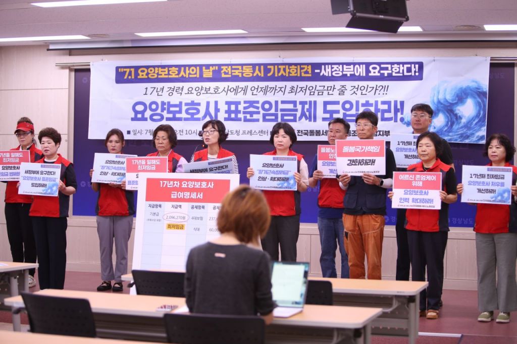 회견에 참석한 한 시설요양보호사는 "치매를 앓거나 침상에 누워 지내는 어르신의 대소변을 받아내고 씻기며 일상을 돕는 건 쉽지 않다"며 "시시각각 변하는 치매 어르신의 폭행 등 돌발행동에서 위협을 느끼기 일쑤지만 돌봄 최전선에서 십수 년을 밤낮으로 일해도 처우는 달라지지 않는다"고 말했다.