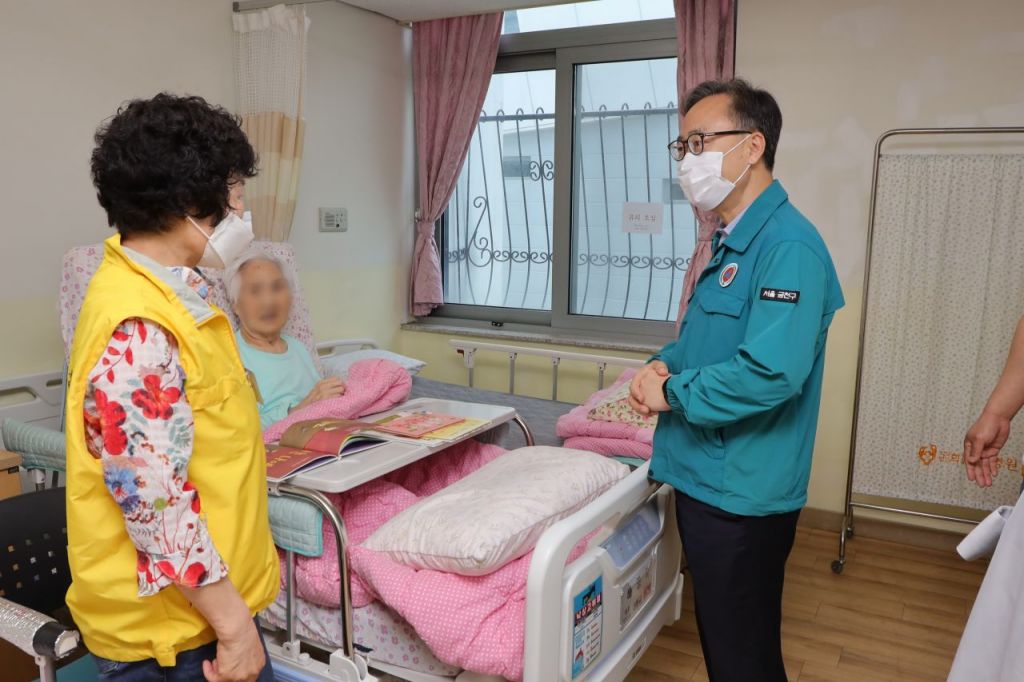 유성훈 금천구청장이 지난 5월 사랑채요양원을 방문해 현장시설을 점검하고 요양기관 관련 종사자와 이야기를 나누고 있다. 금천구 제공.