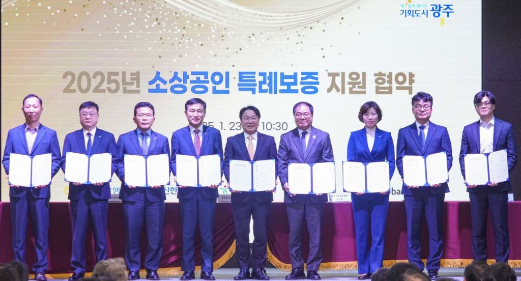 강기정 광주시장이 '2025 광주경제 다함께 착착착' 행사가 열린 지난 1월 23일 광주상공회의소 대회의실에서 광주신용보증재단, 광주은행, KB국민은행, NH농협은행, 신한은행, 하나은행, 우리은행, 카카오뱅크 등 8개 관계기관과 함께 '2025년 소상공인 특례보증 지원 협약'을 체결한 뒤 기념촬영을 하고 있다. 광주시 제공