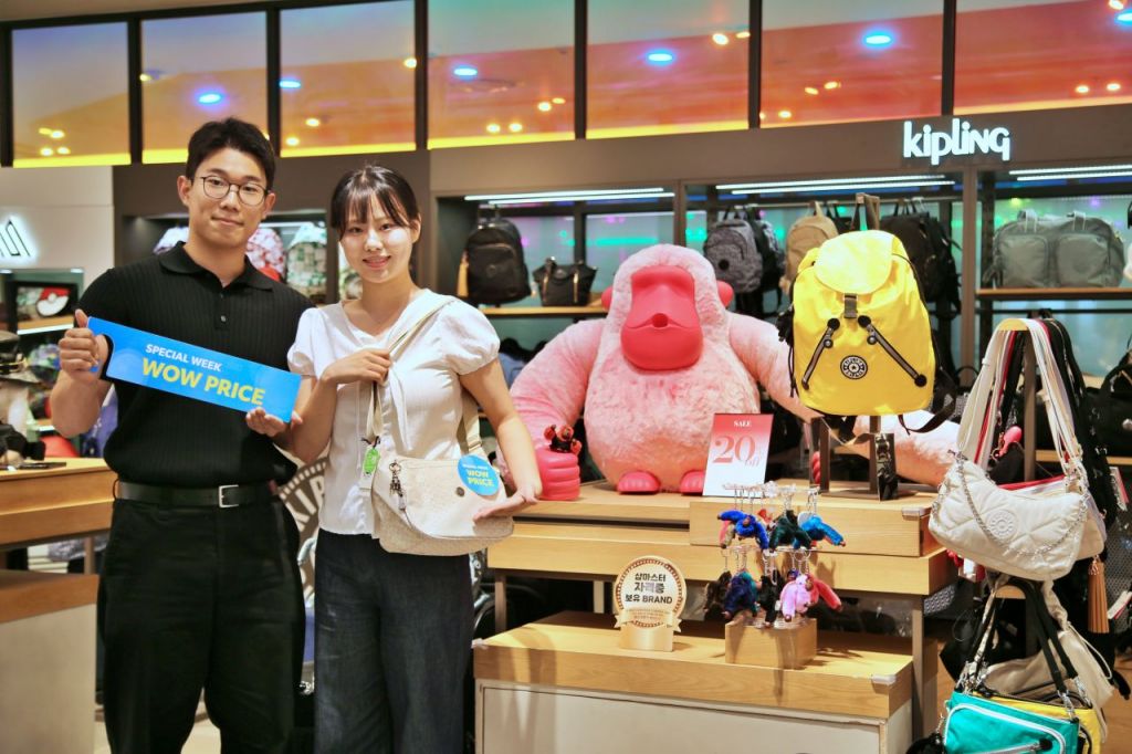 직원들이 플레이스팟 키플링 매장에서 한정수량으로 특별한 가격에 만나볼 수 있는 와우 프라이스 제품인 크로스백을 선보이고 있다. 광주신세계 제공