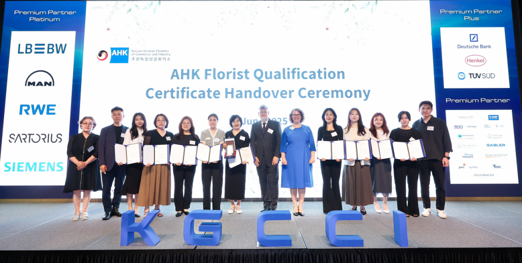 주한독일상공회의소(KGCCI)는 지난달 30일 서울 영등포구에 있는 페어몬트 앰배서더 서울 호텔에서 'AHK 플로리스트' 인증서 수여식을 개최하고 수료생 9명에게 인증서를 전달했다고 2일 밝혔다.