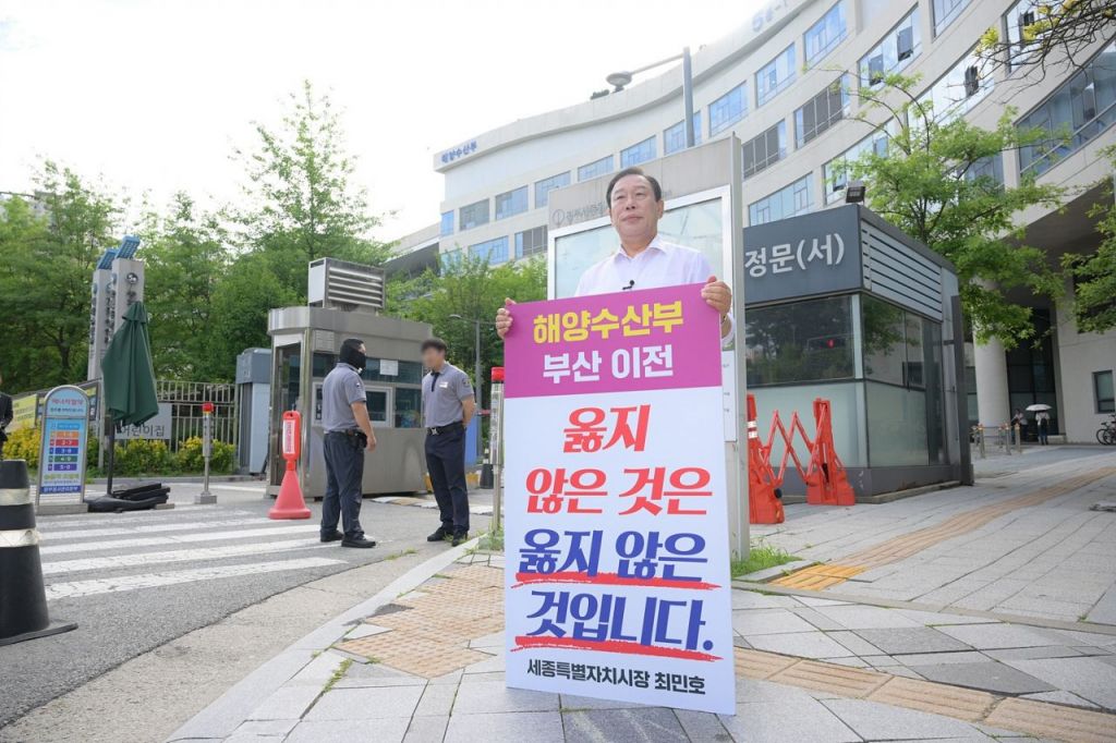 최민호 세종시장이 2일 정부세종청사 해양수산부 정문에서 해수부 부산 이전 반대 1인 시위를 하고 있다. 최 시장은 이날 언론과 인터뷰를 통해 "해수부 단독 이전은 국정 효율성을 저해한다"며 전재수 해수부 장관 지명자와 공개토론을 제안했다. 최 시장의 1인 시위는 오는 4일까지 매일 오전 8시부터 9시까지 1시간 동안 전개할 계획이다.