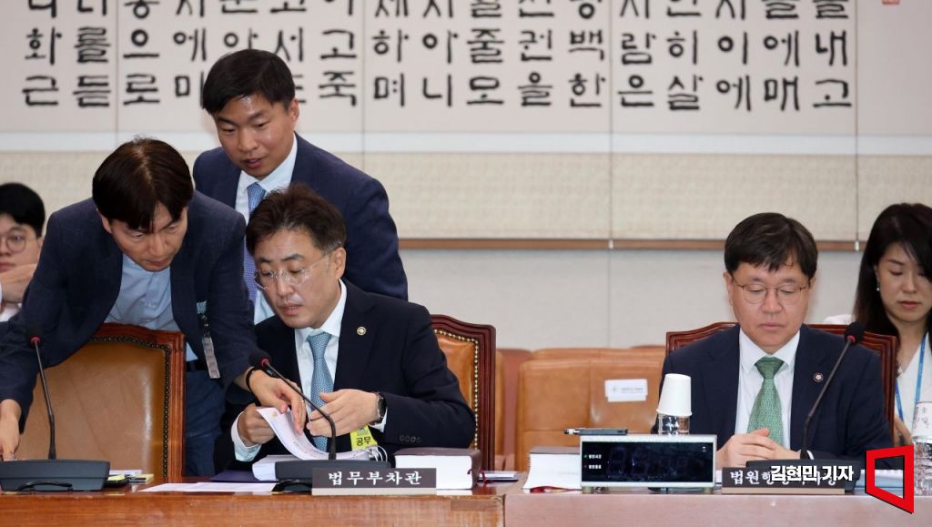 이진수 신임 법무부 차관이 2일 국회 법제사법위원회 법안심사제1소위원회에서 관계자의 보고를 받고 있다. 오른쪽은 배형원 법원행정처 차장.