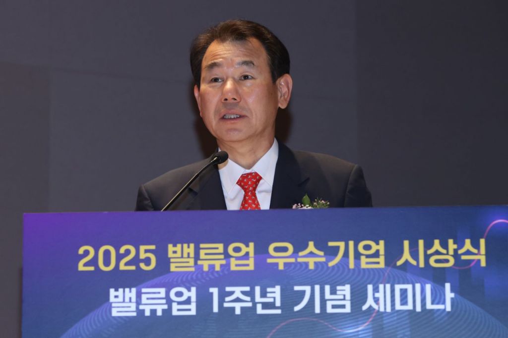 정은보 한국거래소 이사장이 5월 27일 서울 여의도 한국거래소에서 열린 2025 밸류업 1주년 기념 세미나에서 개회사를 하고 있다. 연합뉴스