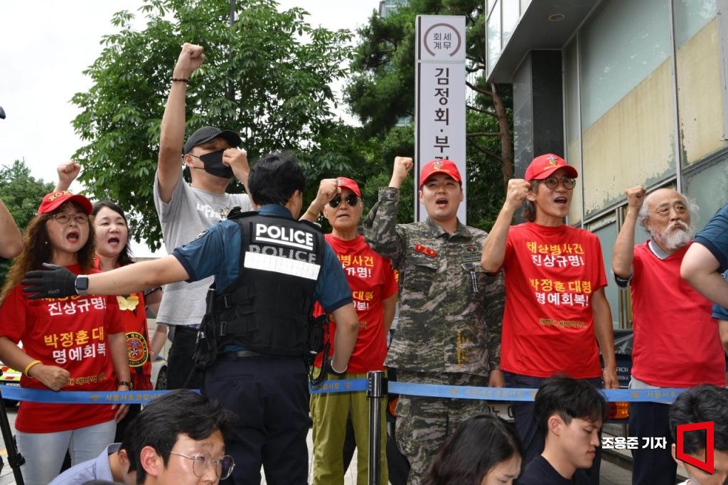 2일 서울 서초구 채상병 특검 사무실 앞에서 임성근 전 해병1사단장이 입장을 발표하자 정원철 해병대 예비역 연대 회장을 비롯한 예비역들이 항의하고 있다.