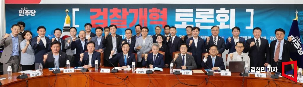 2일 국회에서 열린 더불어민주당 검찰개혁토론회에서 당대표 후보인 정청래·박찬대 의원과 토론회 주최자인 민형배, 김용민, 장경태 의원 등 참석자들이 기념촬영 하고 있다.